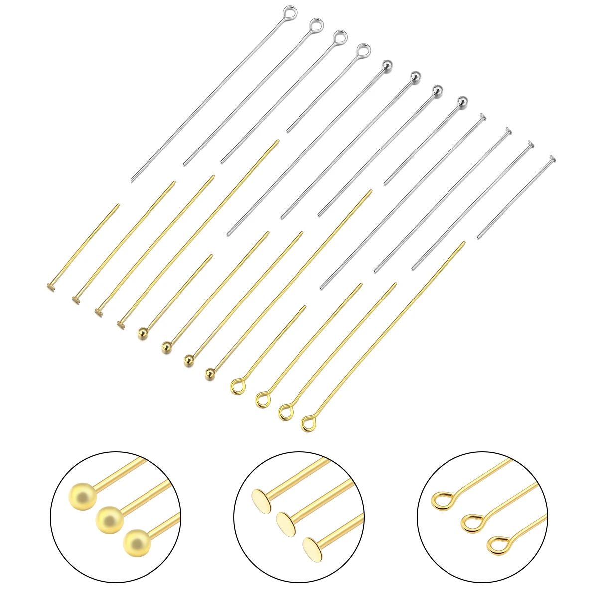 These gold and silver head pins are essential tools for jewelry-making projects.
